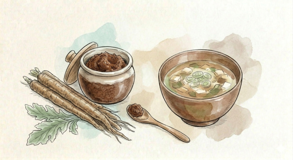 ごぼうは食物繊維が豊富で、腸内環境を整える力があります。みそと組み合わせることで、発酵の力とプレバイオティクスの効果が同時に得られる。作り方はシンプルです。ごぼうをすりおろしてみそと合わせるだけ。温かいごはんに乗せても、白湯に溶かしても。春の腸に、そっと寄り添ってくれます。